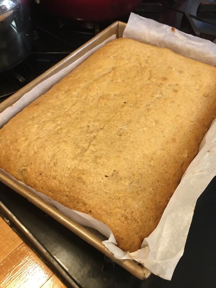 This very banal looking cake is especially nice on such a day. Beneath its surface is a lovely aromatic blend of fresh Granny Smith applesauce, cinnamon, nutmeg, vanilla, and cloves.