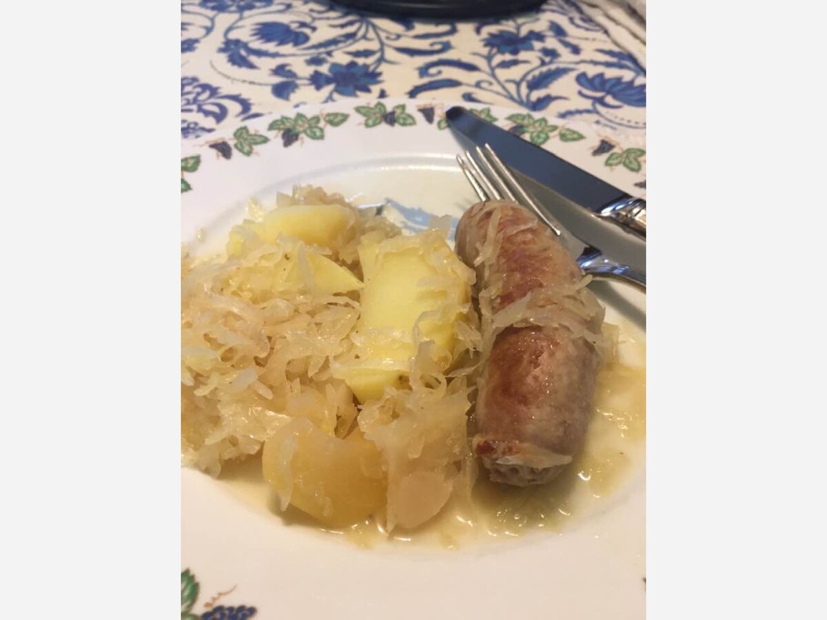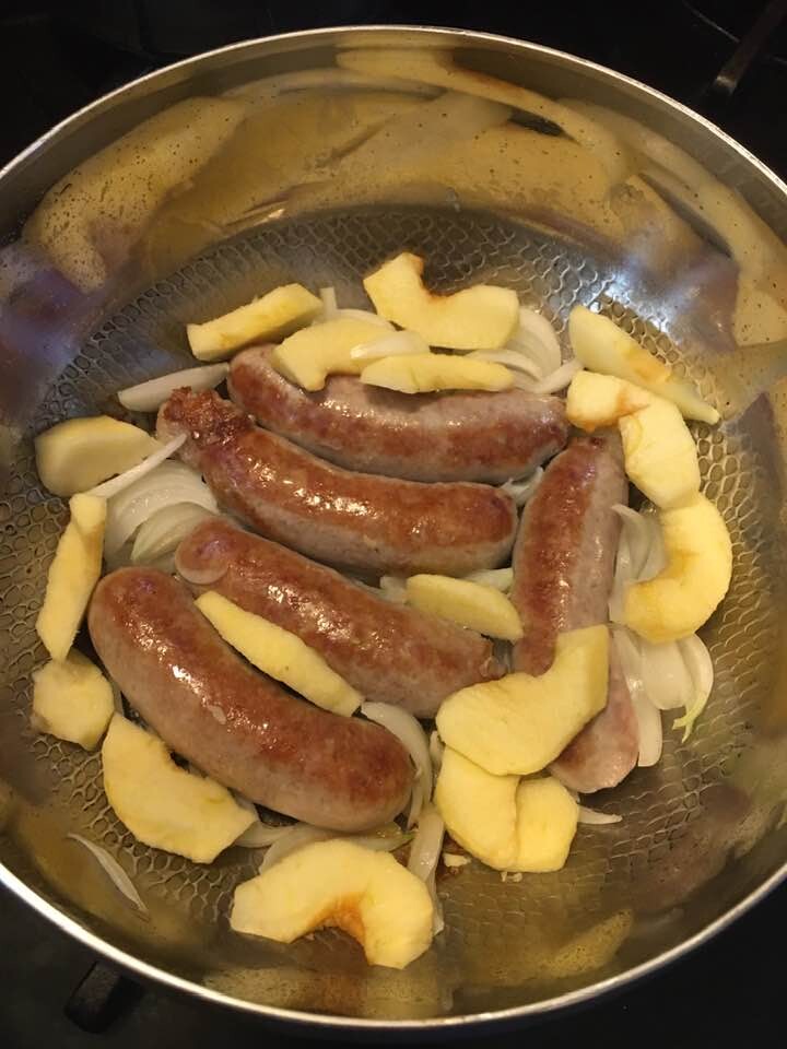 We were fortunate to find some excellent brats made of pork and veal, lightly seasoned with salt marjoram and onion. I browned them with onions and apples, then simmered them in chicken broth with the addition of German sauerkraut and Yukon gold potatoes.