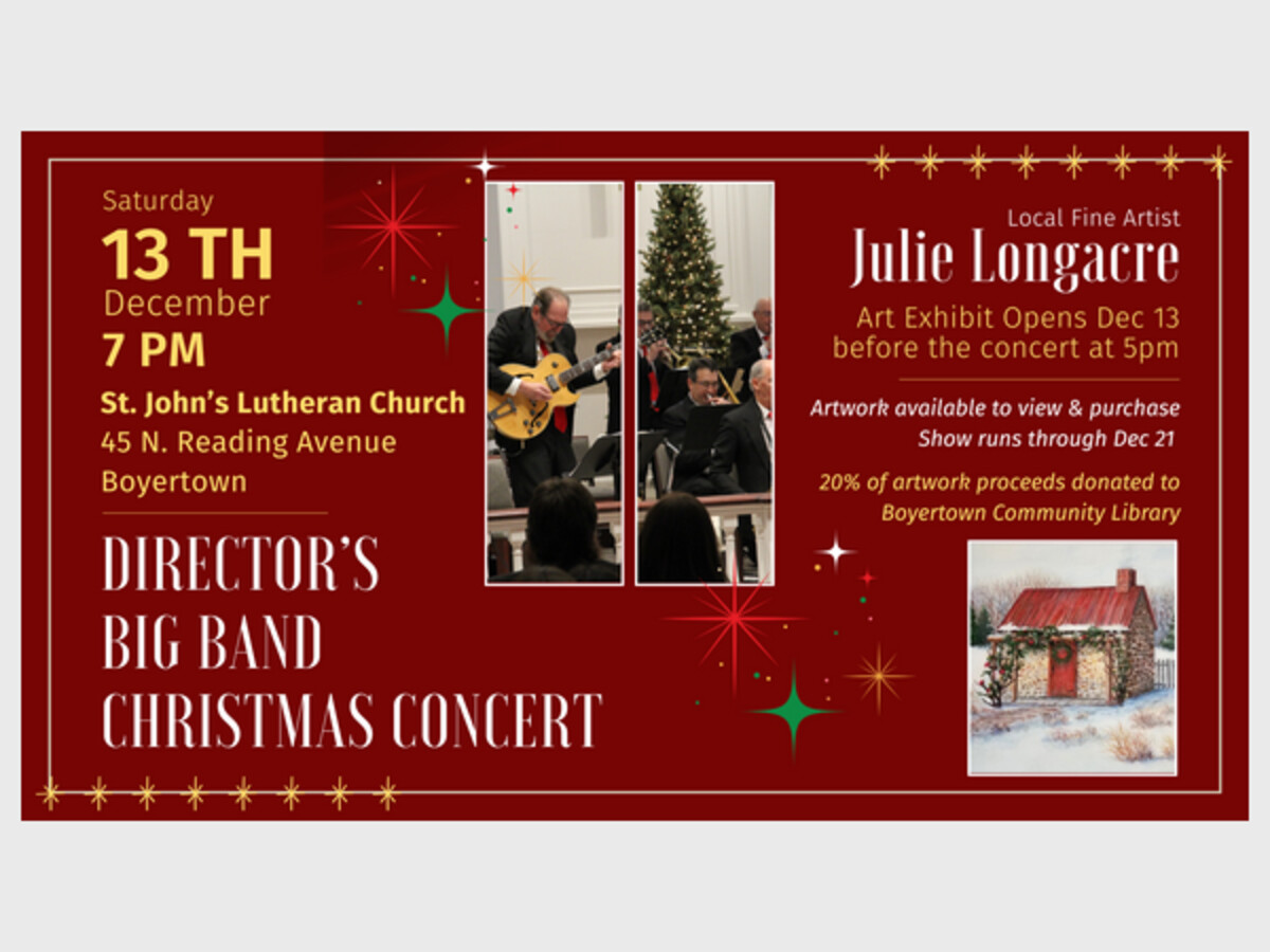 Get into the holiday spirit with an unforgettable evening of festive music and local creativity! Join us for the Director's Big Band Christmas Concert on Saturday, December 13 at 7:00 pm, featuring a live performance of classic and contemporary Christmas tunes by a full big band that will have you tapping your toes and feeling the joy of the season.