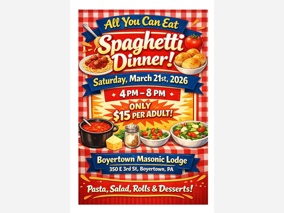 ALL YOU CAN EAT - Spaghetti, Meatballs, Salad, Rolls, Dessert and Beverages. Held Saturday March 21st, 2026 from 4:00 – 8:00PM.