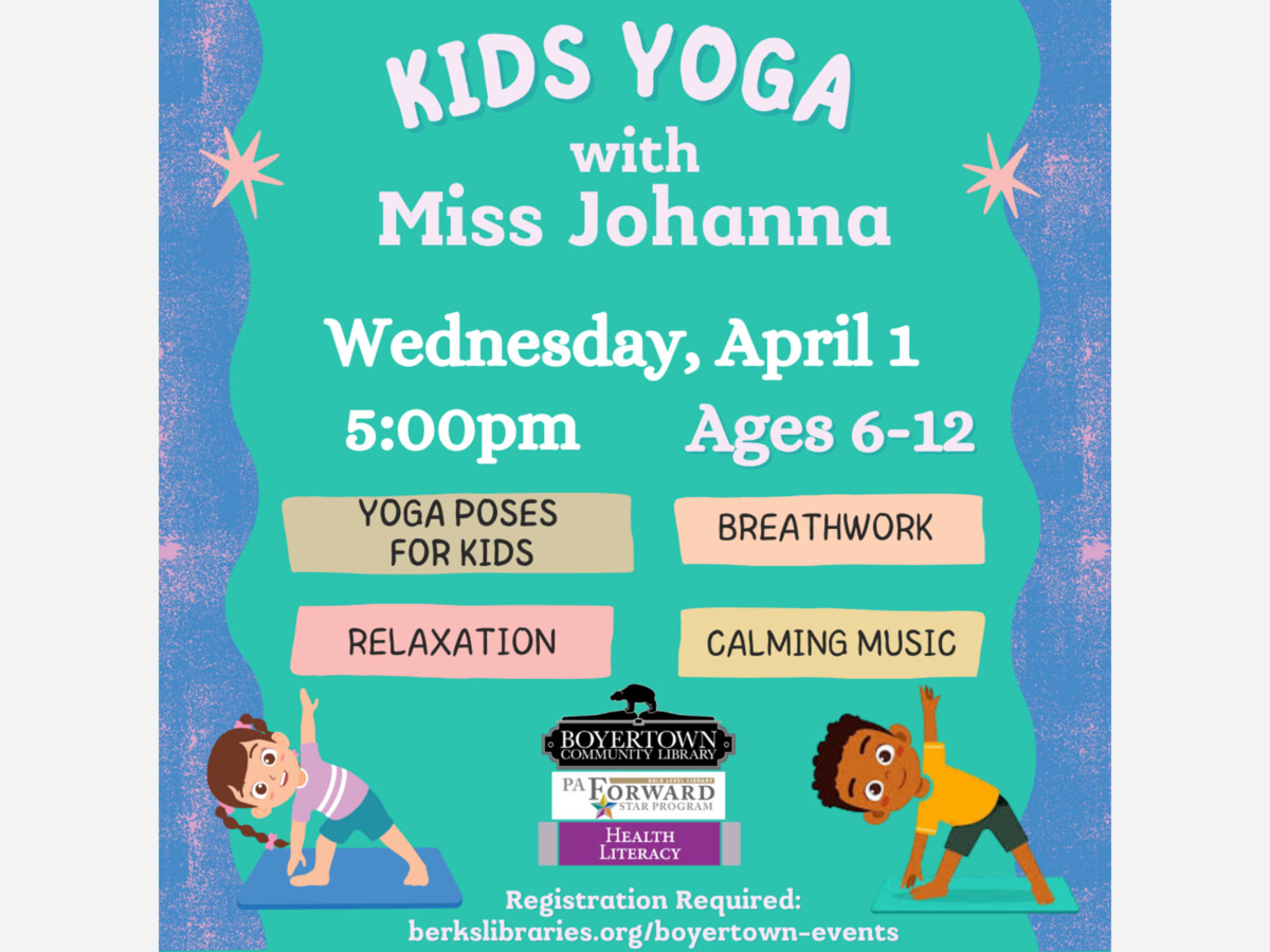 Miss Johanna is coming to teach a kids yoga class! The class will include age-appropriate yoga, breath work, music, mindfulness games, and relaxation. Namaste!