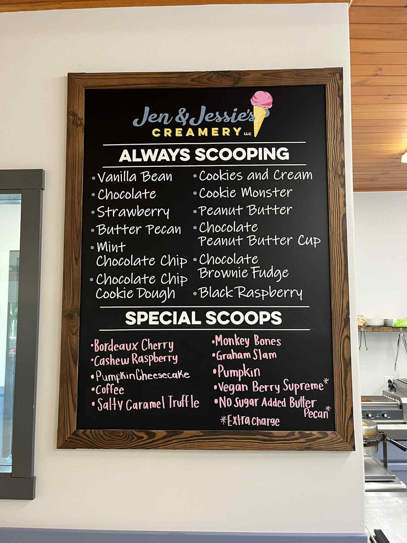 Jen and Jessie’s is operated by Jennifer Ritschard, a food science major from Penn State University. Her parents originally opened the shop in 2004, but retired and passed the business on to her. Jennifer puts her degree to use, creating unique flavors that are hard to say no to. Bordeaux Cherry, Pumpkin, Pumpkin Cheesecake, Caramel Apple, and Monkey Bones (banana ice cream with chocolate, graham cracker chunks, and peanut butter). Things that a food science major would conjure up.