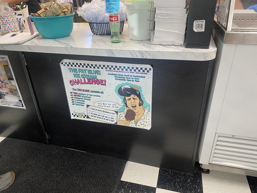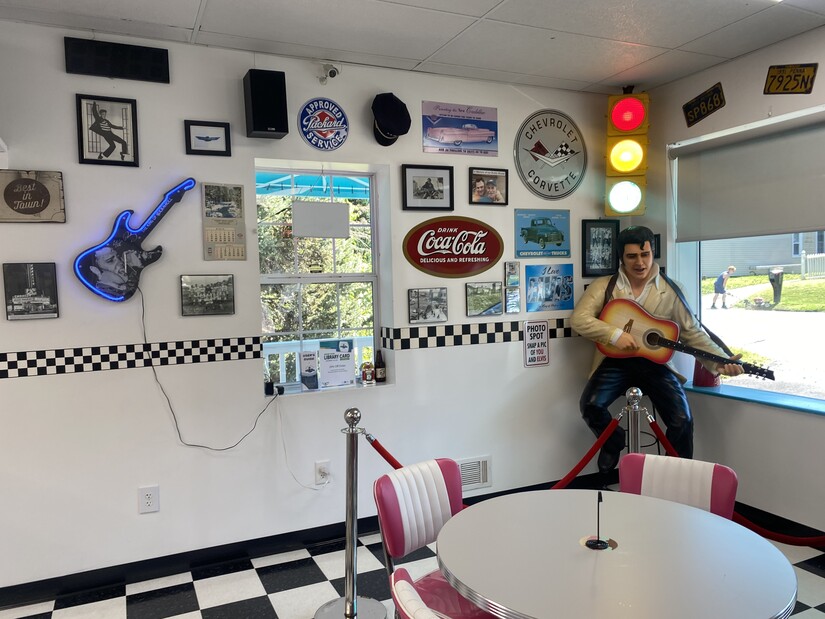 The day moved into early afternoon. Our collective appetites for ice cream were waning under the strain of three creamery feasts. We recharged with a nice drive to Birdsboro. Scoupe deVille is, upon first blush, all about the atmosphere. It’s chock full of oldie roadside nostalgia. Stoplights, an old gas pump, pictures of old cars, a guitar-strumming life-size Elvis in the corner. Beach Boys music was streaming across the eating area.