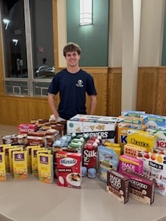 Liam Matlack stands with the donated food items that will be donated to CHOP's (King of Prussia) newly established food pantry to support food insecurities among allergy families.