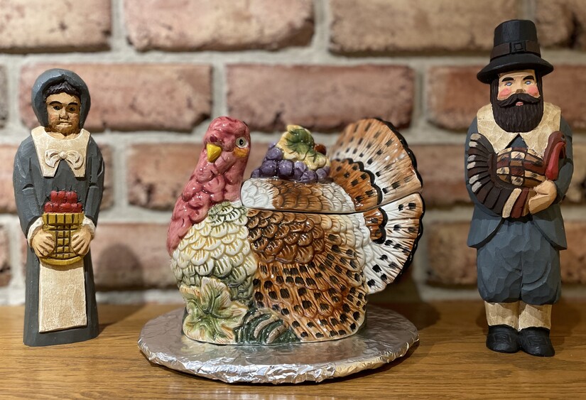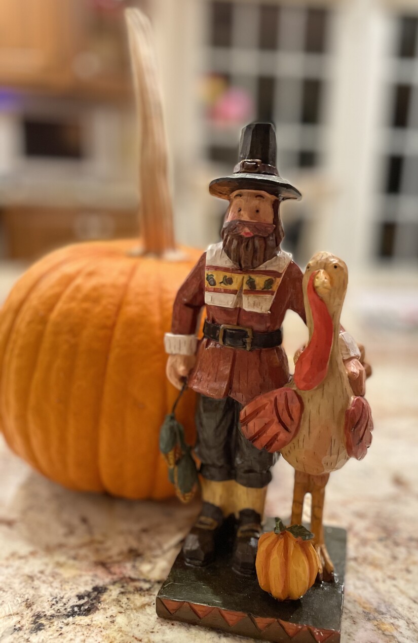 Thirty-five years later, with my sister-in-law soon to wing her away across the country to join us for the holiday, we thought we would do some decorating and that is why I came to be sitting at my kitchen table, staring at carved wood figurines of several pilgrims and thinking of my encounter that long ago summer day with Mr. Billington and his fellow travelers.