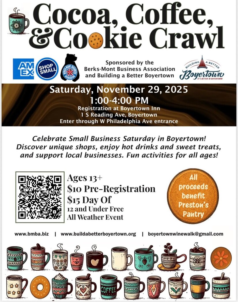 The collaboration between Building a Better Boyertown and Berks-Mont Business Association for the upcoming Cocoa, Coffee & Cookie Crawl on Small Business Saturday, November 29, 2025, from 1-4 p.m. promises to be a yummy treat!