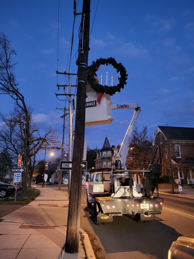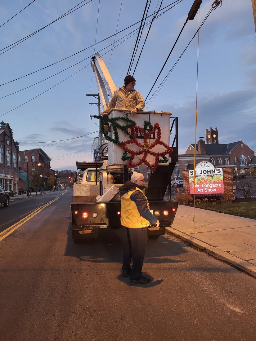 From there we distribute ornaments at the poles on Philadelphia and Reading Avenues. T L Conrad Electric donates their time and equipment to install the lights. We owe our thanks to Terry and Todd.
