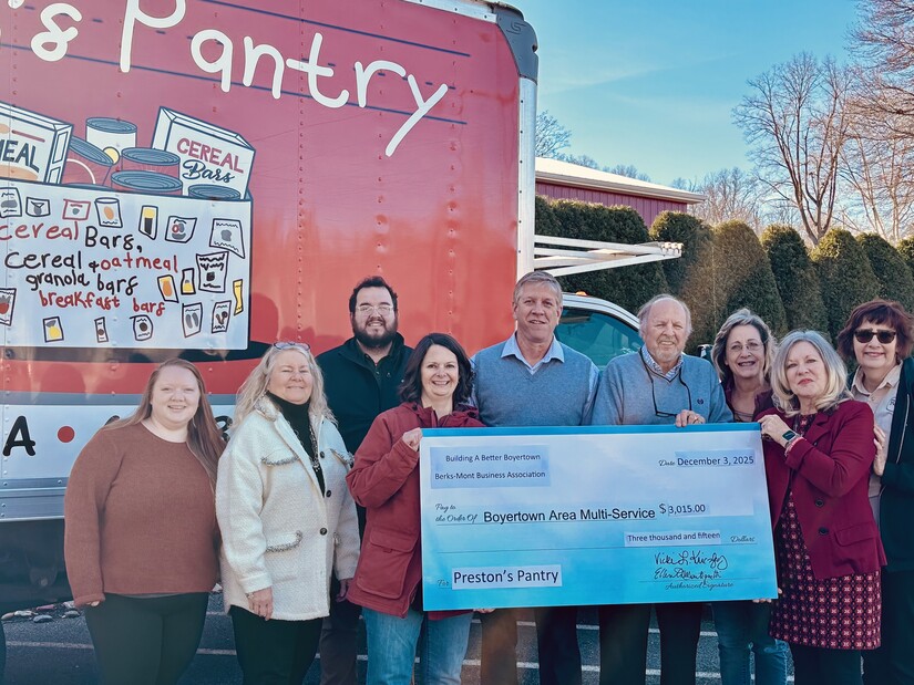 Boyertown, PA — The Berks-Mont Business Association and Building a Better Boyertown have presented the Boyertown Area Multi-Service with a $3,015 donation to support Preston’s Pantry. The funds were raised during the inaugural Cocoa, Coffee & Cookie Crawl held on Small Business Saturday®, November 29, 2025.