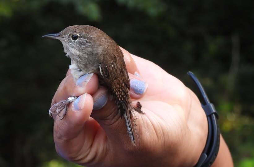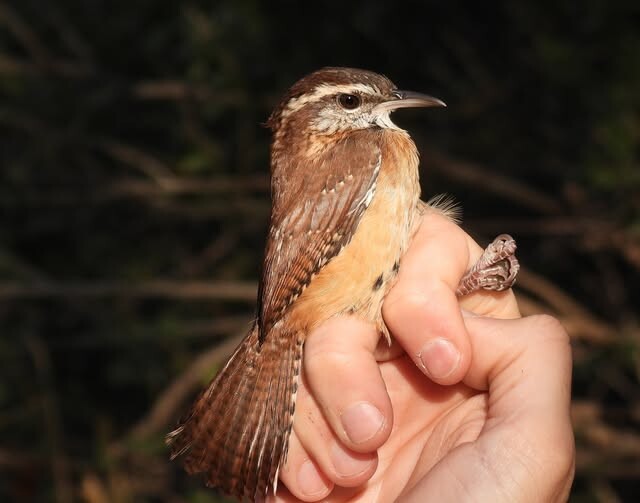 This picture of a house wren was taken during a recent bird banding session. We have house wrens nesting in our backyard but they are more secretive and shy than the attention-seeking Carolina wren.