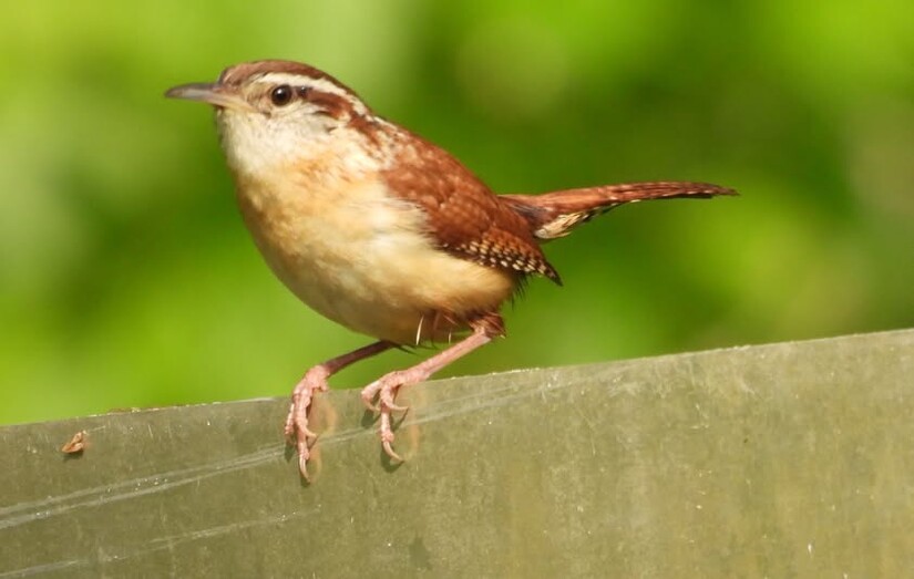 The Carolina wren is physically very distinctive. It’s about the size of a golf ball and has a tiny tail that often sticks straight up. It’s rusty-brown, with buff plumage. Its most distinctive field mark is the sharp white eyebrow.