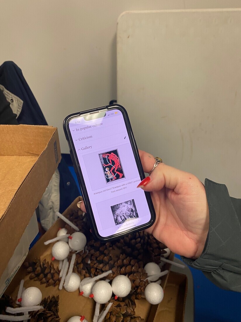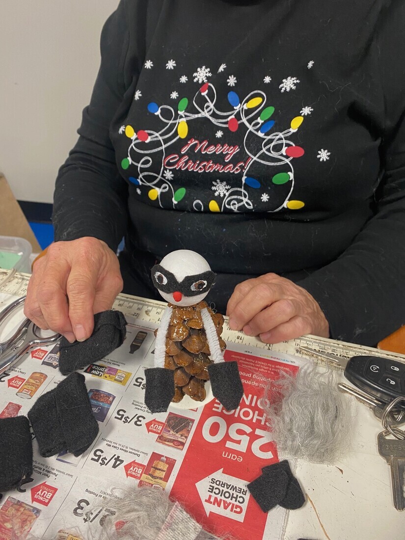 The Belsnickel figure is fashioned from a pine cone base and dressed differently each year using specially selected fabrics and materials. Special pine cones are needed for the project that Rose collects herself or that friends bring her.