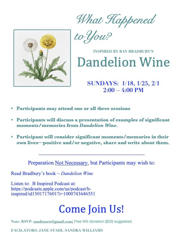 January 18, 25, and February 1, from 2-4 p.m.: Join me and Sandra Williams in a series of writing workshops "What Happened to YOU?" inspired by Ray Bradbury's novel Dandelion Wine.