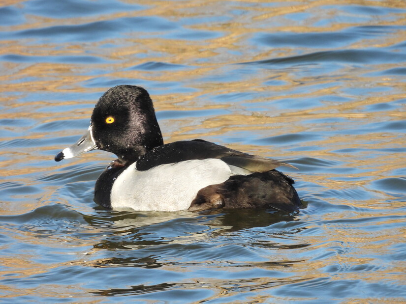 The ring-necked duck is a lovely waterfowl that is identifiable by the ring around its bill and its piercing eye. The ring around its neck, for which it is named, can only be seen when it is in flight. We found this ring-necked duck in a tiny pond in a downtown Baltimore park.