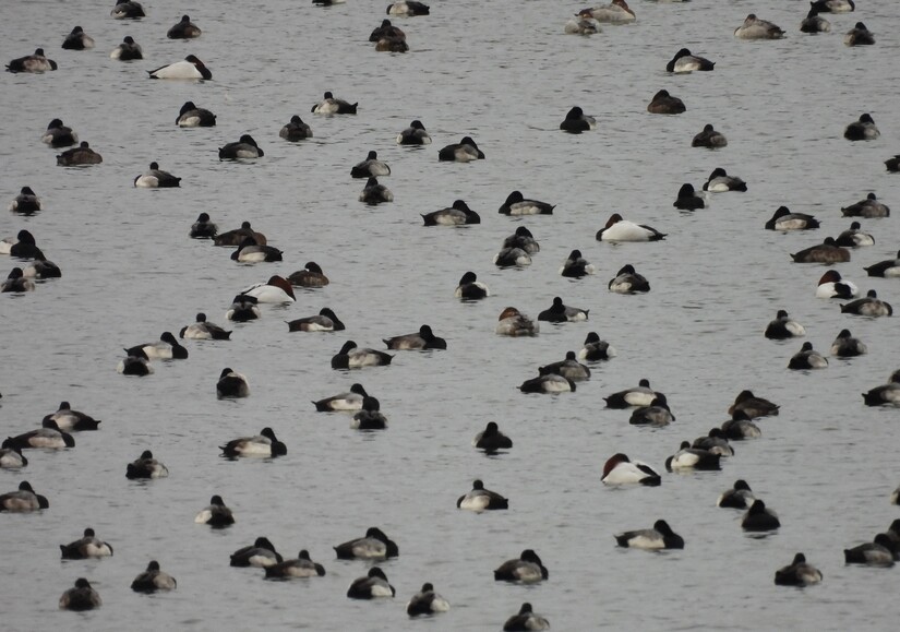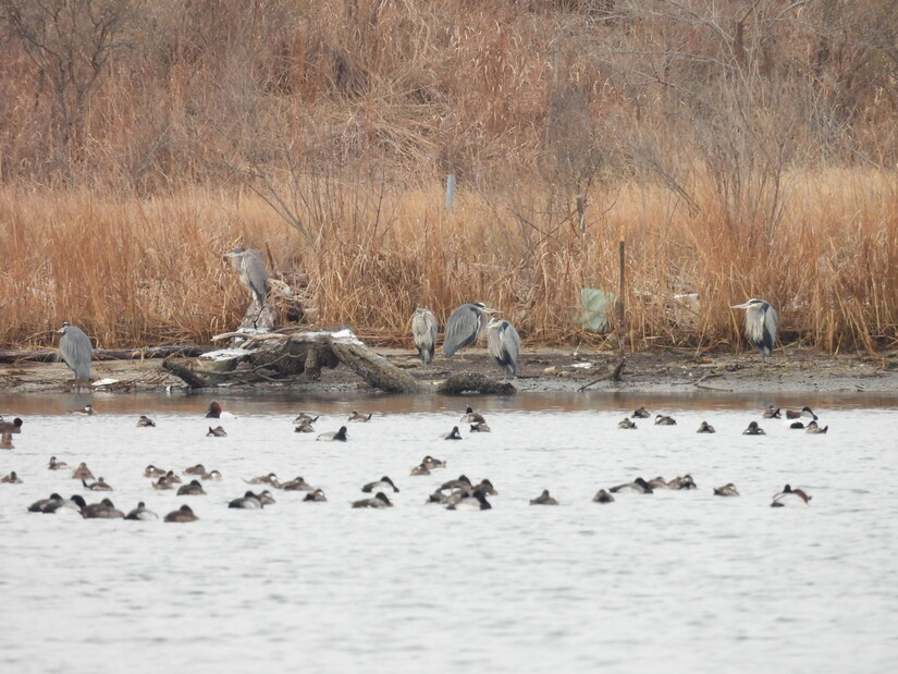 Masonville Cove, a former industrial area of Baltimore city that has been converted to marshland and a hiking trail system, hosts massive numbers of birds throughout the winter. The ducks often aggregate into large rafts numbering in the hundreds, and sometimes the thousands. This first picture is a section of a large duck raft that is composed mostly of greater and lesser scaups, canvasbacks, and ruddy ducks. The second picture is of a small raft of ruddy ducks being watched over by a dozen great blue herons.