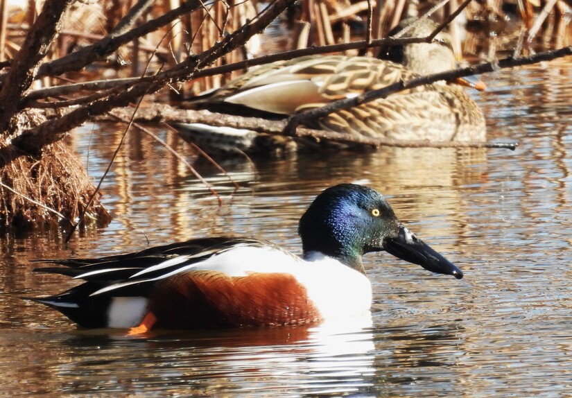 Northern shovelers have large, paddle-like bills that they use to dredge the bottom mud of shallow ponds, hoping to stir up some dinner. Their bold chestnut side makes them easily identifiable, even from a distance. We found this northern shoveler in the same pond in downtown Baltimore.