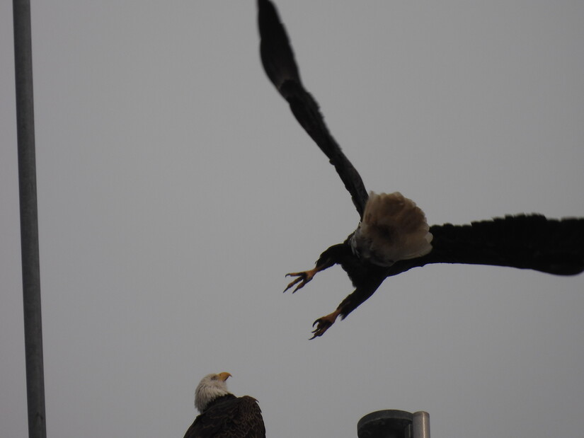 Bald eagles are beginning their mating and nesting cycle in January. We saw many bald eagles over our three days, as they are common along Chesapeake Bay parks. We observed this bald eagle pair erecting a massive nest on a radio tower in Sandy Point State Park.