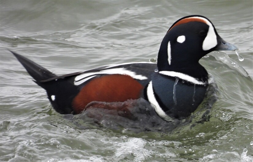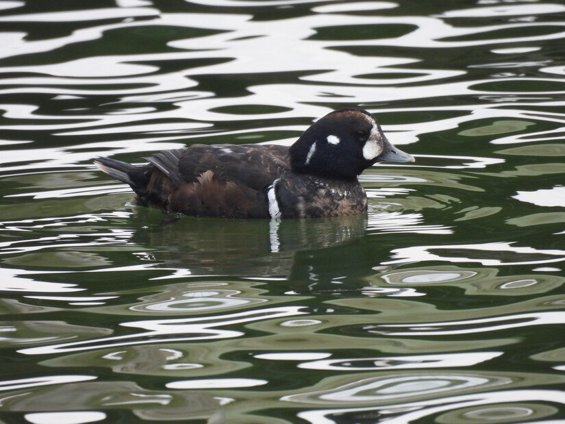 Another unusual bird we were fortunate to observe was this harlequin duck. They are typically found in northern regions of the east coast, along rocky, wave-battered coasts. This one seemed out of place padding around placid waters beneath a dock on Kent Island, in the Chesapeake Bay. This particular harlequin duck appears to be a juvenile since its colors are not fully developed. For comparison, the second picture is of a mature harlequin duck I took last year at Barnegat Inlet, in New Jersey.