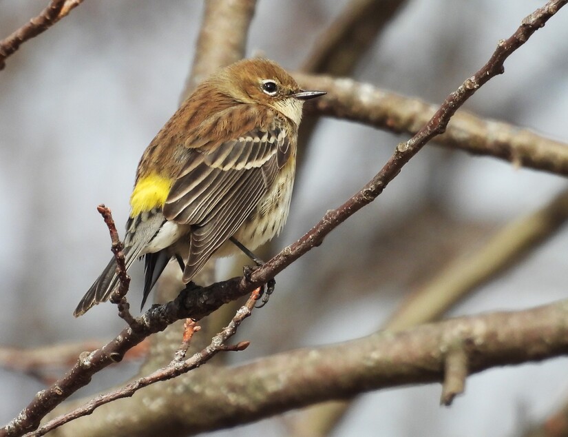 Virtually all warblers in our region migrate south in winter, except for one species. They are chasing bugs that disappear from our area in winter. The yellow-rumped warbler is the only warbler that has the ability to digest the waxy skin of berries seen in winter on various bushes, and as such sticks around all winter. This one, seen in Sandy Point State Park, proudly shows off its namesake posterior.