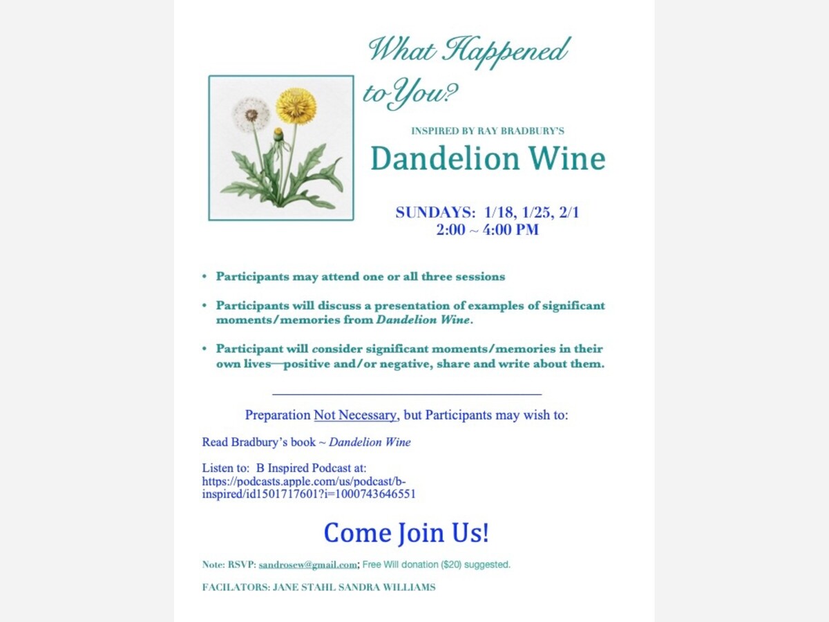 January 18, 25, and February 1, from 2-4 p.m.: Join me and Sandra Williams in a series of writing workshops "What Happened to YOU?" inspired by Ray Bradbury's novel Dandelion Wine.