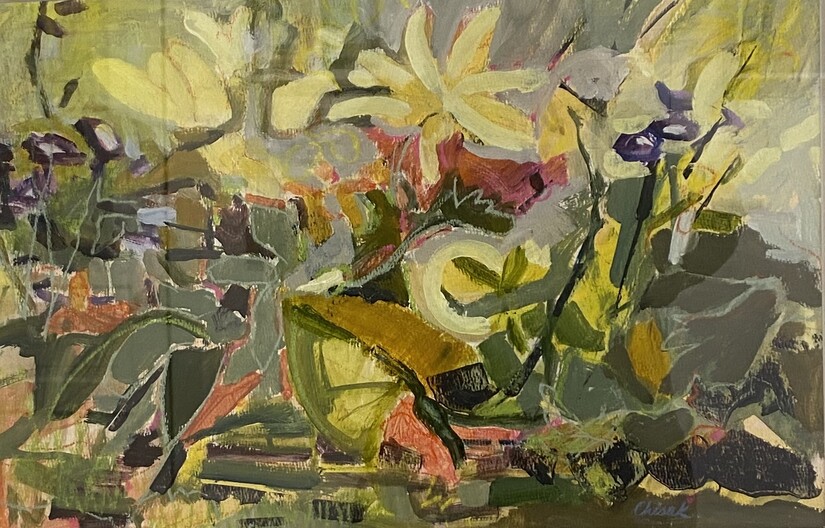 Mary Chisak's acrylic and pastel painting "Spring Garden" took fifth place and again reminded gallery-goers that if winter's here, spring's daffodils are next on the seasonal agenda.