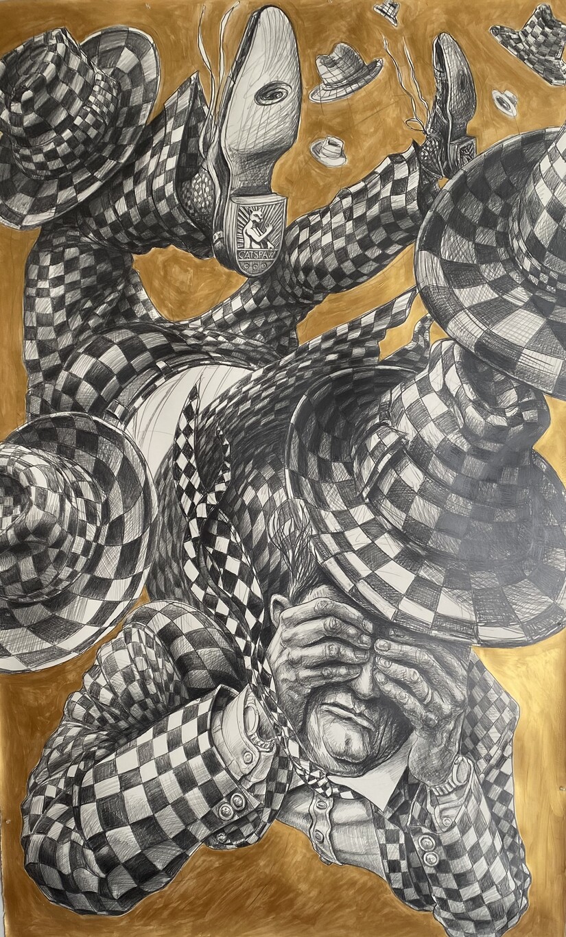 Jim Meehan, frequent award-winner at Studio B, chose to respond to "land" as a verb in his pencil on paper piece titled "Gravity."