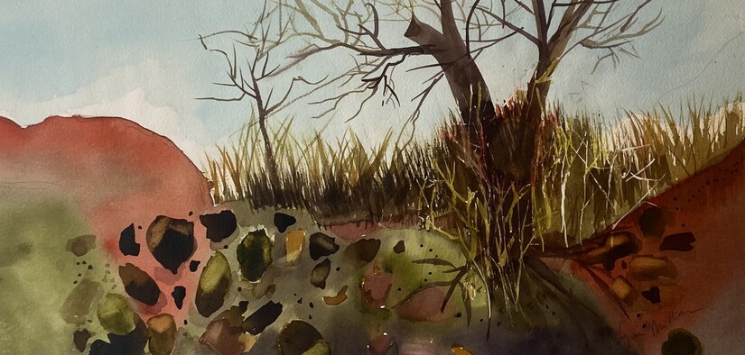 Lynn Millar was awarded third place for her watercolor "Edge of Fall II". Lynn is a frequent award-winner offering diverse responses in multiple mediums to the gallery's themes.