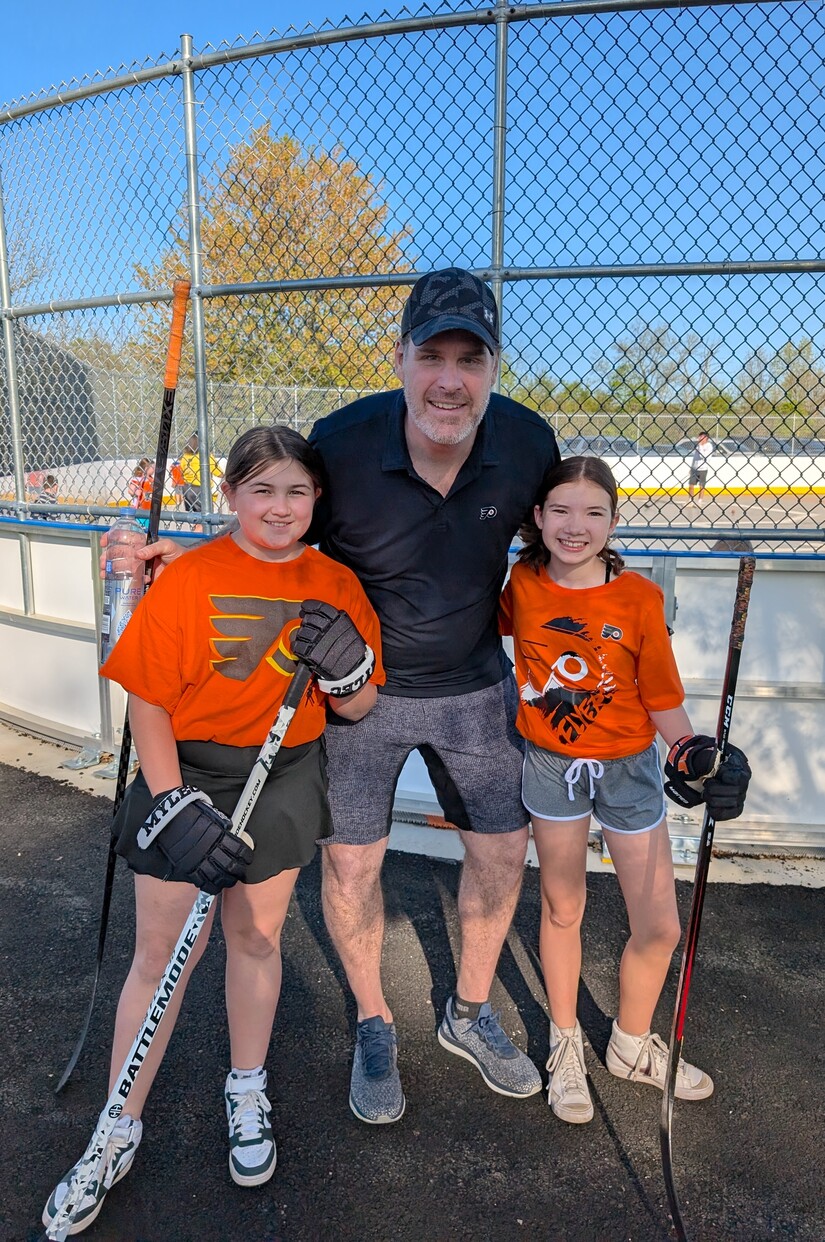Former Flyers Defenseman Chris Therien stands with Lilly Walter, left, and Natalie Van Druff, right - the two young girls who saved their ball hockey rink from turning into Pickleball and rebuilt it with a miraculous donation from the Flyers Charities. “We are excited to share this opportunity in the greater New Hanover community, as there are limited opportunities for young kiddos to try ball hockey in this low-pressure environment,” said Liz Crouthamel, Co-Vice President of PUSH and Director of Women’s Development with USA Ball Hockey. “It’s surreal we get to continue to partner with the Flyers via the Learn to Play program, and how special for these kiddos to wear the Flyers logo on their equipment!”