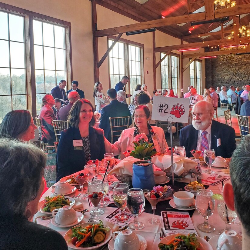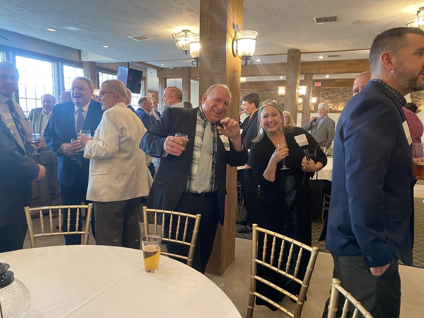Prior to dinner and the award ceremony, were members of the community ready to celebrate. President of Boyertown's Borough Council Frank Deery is flanked by the Chamber's celebratory sign and members of the community.