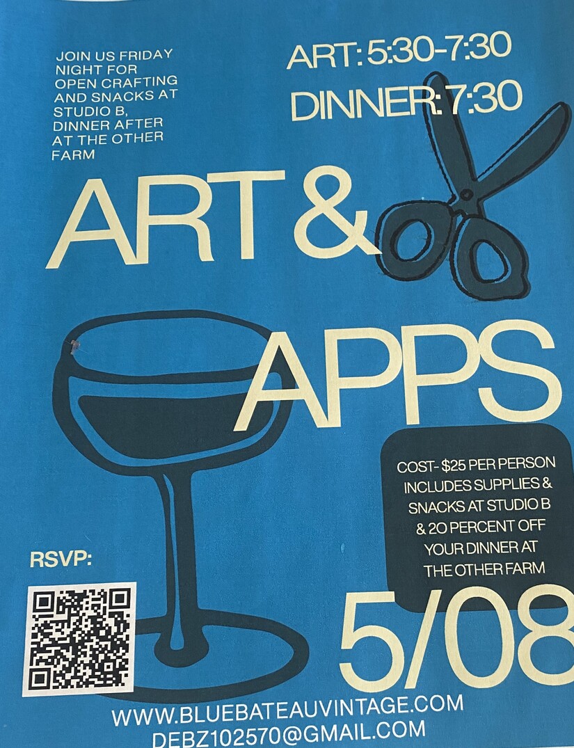 2. "Art & Apps" on select Friday evenings providing several hours to work together on projects while enjoying wine & appetizers, followed by dinner at Other Farm with a 20% off coupon.