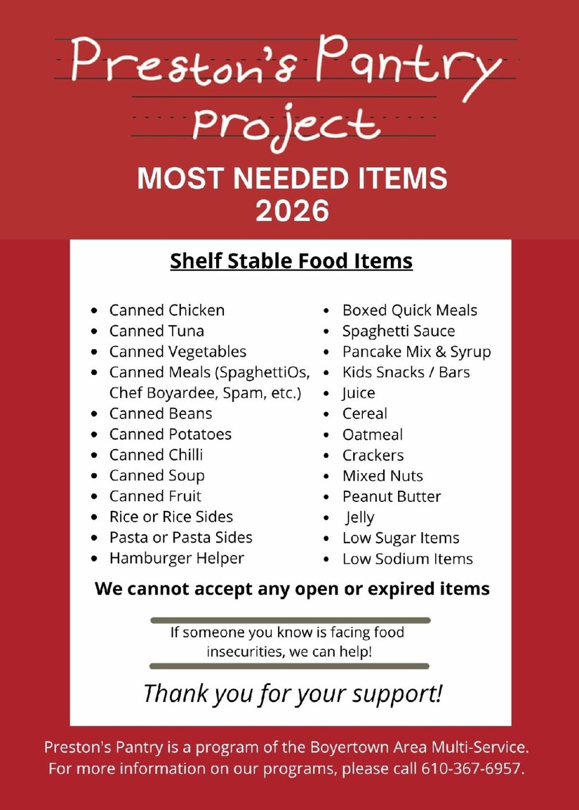 Boyertown Area Multi Service invites the community for a day of fun on Saturday, May 2, 2026, from 10 a.m.-2 p.m. and will be collecting food donations in honor of the young boy whose tragic death with his mother and unborn sister remain a heart-breaking community memory.