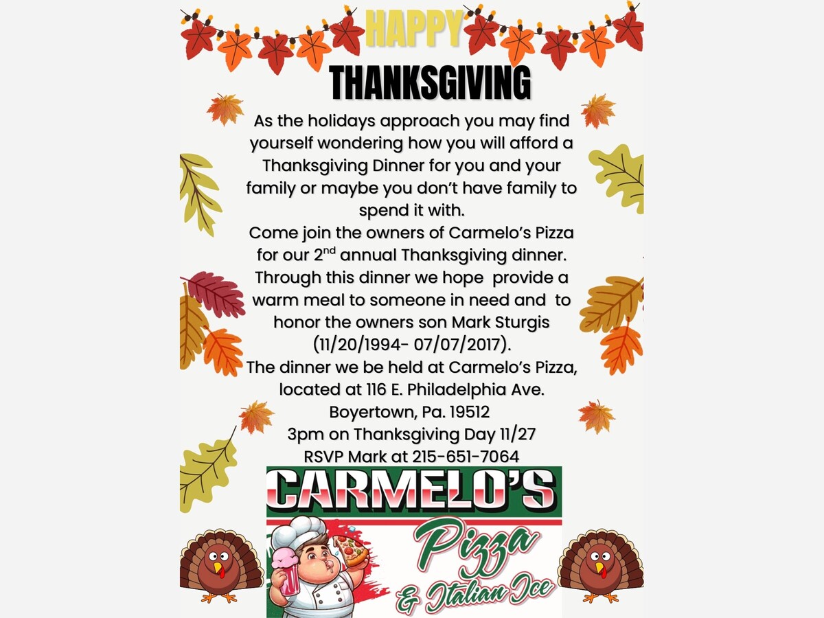 Mark Potash, owner of Carmelo's Pizza & Italian Ice, 116 E Philadelphia Ave., Boyertown, invites those in need or without family to join his family for his second annual Thanksgiving Dinner on Thanksgiving Day (11/27/2025) beginning at 3 p.m.