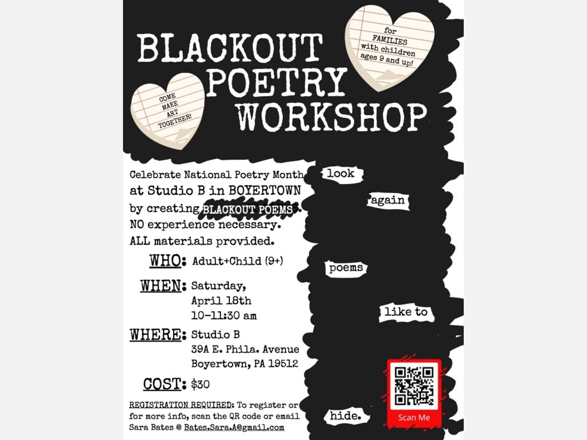 Celebrate National Poetry Month at Studio B in Boyertown by creating BLACKOUT POEMS.